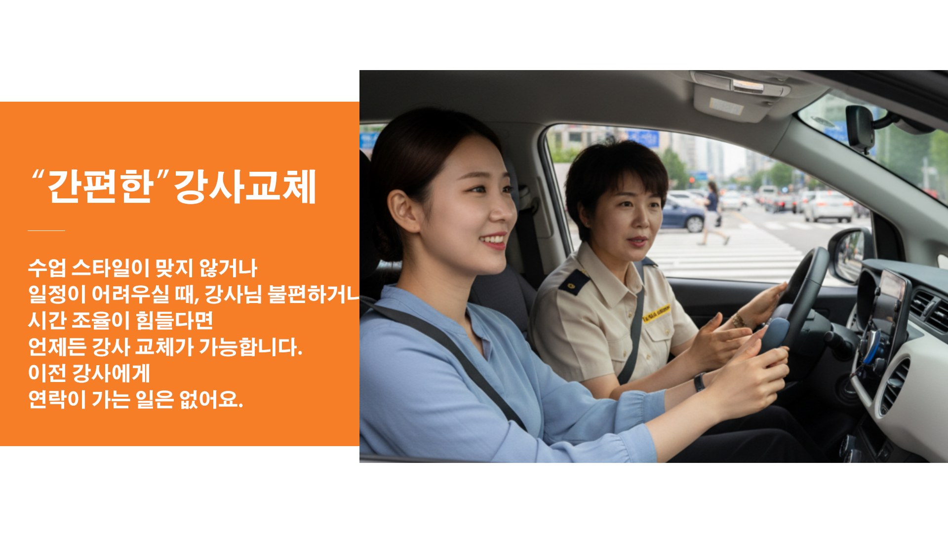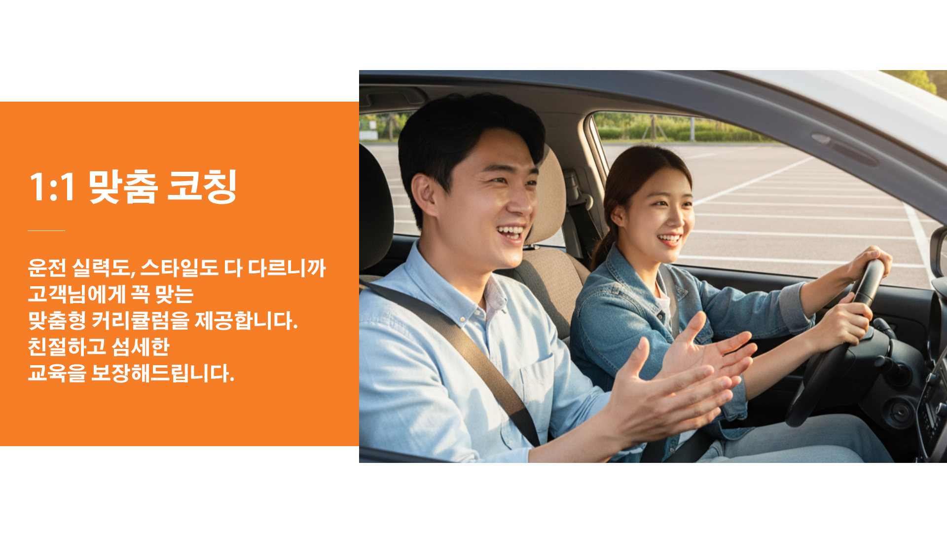 기본은 보조브레이크가 장착된 연수차량으로 진행됩니다. 원하면 자차 연수도 가능하지만 안전장치와 보험 조건을 반드시 확인해야 합니다.